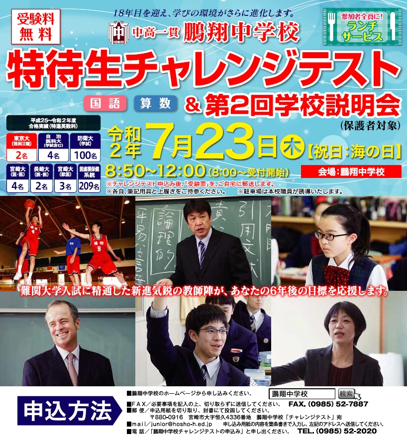 次は7月23日(木・祝)に第1回特待生チャレンジテスト&第2回学校説明会を行います。申し込みを本校ホームページトップより受け付けておりますので、ぜひご参加ください。