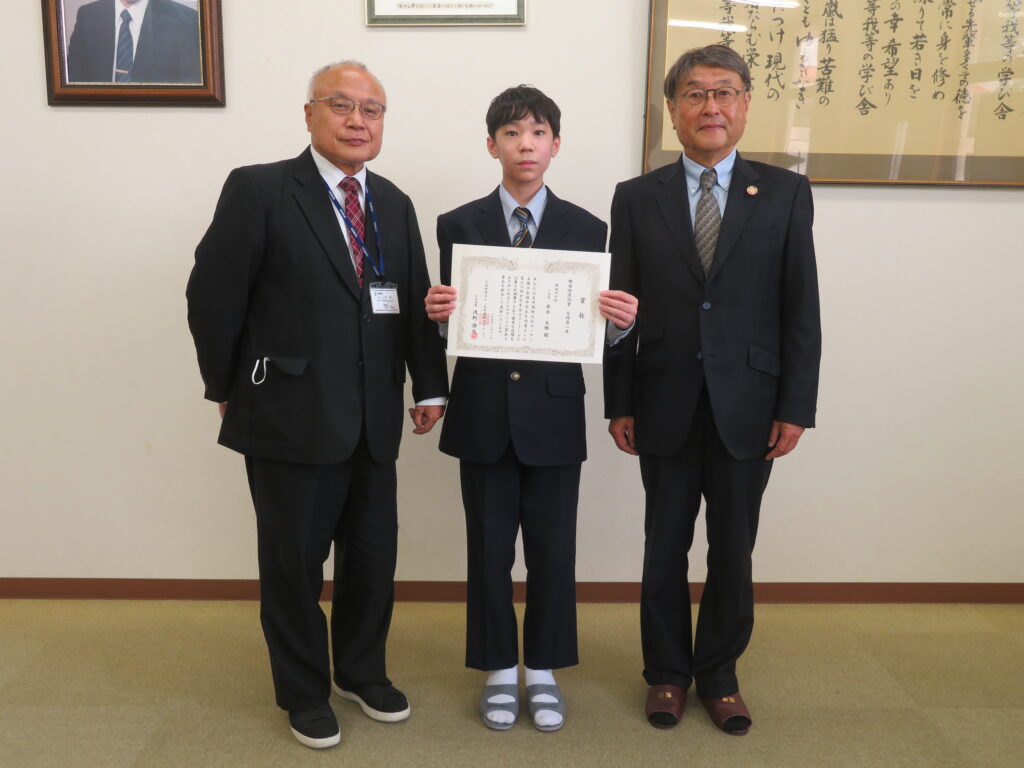 先日、2022年度第60回中学校作文コンクール「わたしたちのくらしと生命保険」で受賞したJ1-B井手大雅さん(学園木花台小出身)の表彰式が執り行われました。