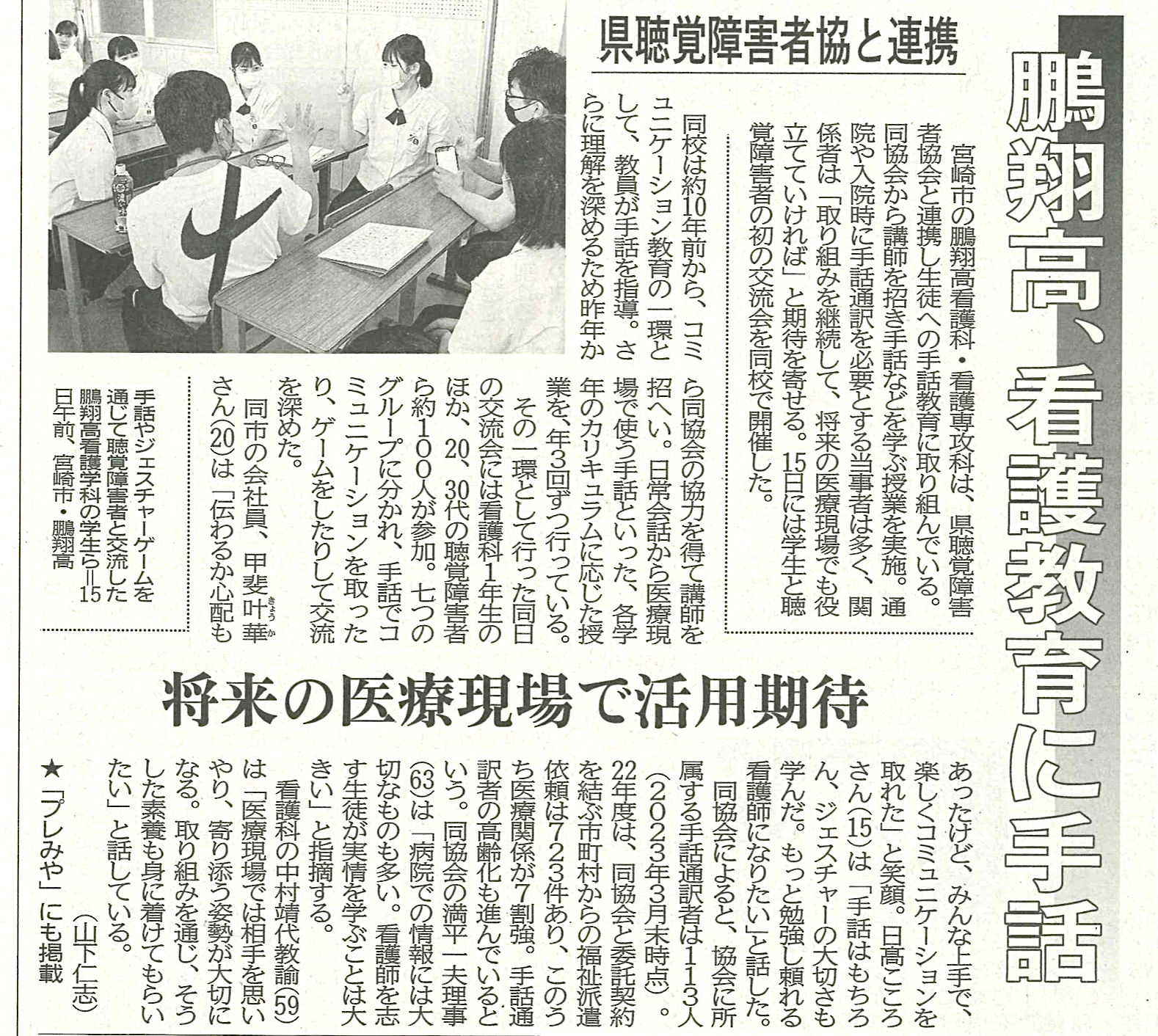 学校行事 手話交流会を開催 高塚順 2023-07-19 7月15日(土)、看護科・看護専攻科が手話交流会を開催。同交流会には聴覚障害者ら約100人が参加。看護科1年生と手話でコミュニケーションを取り、親睦を深めました。同日の模様は、7月16日付けの宮崎日日新聞にも掲載されました。 https://www.hosho.ed.jp/wp-content/uploads/2023/07/IMG_1005.jpg