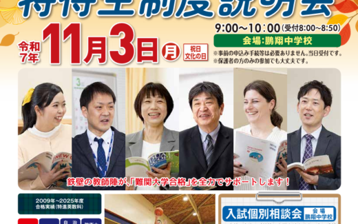 【説明会のご案内】 ◎11月3日(月・祝:文化の日)に「特待生制度説明会」を実施します。 こちらは事前申し込み不要で、当日の受付となります。 詳細は下記画像をクリックしてください。 また、あわ