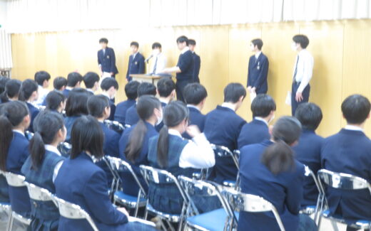 特進英数科3年生(中高一貫18期生)は、本日と明日、宮崎公立大学で行われる大学入学共通テストを受験します。特進英数科100名、英数科7名の高校生が、早朝、中庭の出発式で校長先生、教頭先生の激励を受け、りりしい面持ちで出