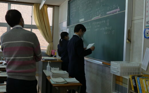 こんにちは。本日は1年生の数学の授業風景をお届けします。 本日の授業内容は「連立方程式」で、加減法や代入法といった方法を学び、それらを用いて、問題を解いていました。 授業の前半では問題を解くのに時間がかかる生徒や、答