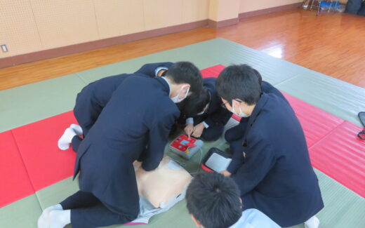 今週の保健の時間、J2生は、心肺蘇生法やAEDの使い方など、応急手当について学びました。 先生の説明を聞いた後、各自、手を置く位置や胸骨圧迫の仕方など、友だちと確認しながら実践していました。 初めてAEDを使う生徒