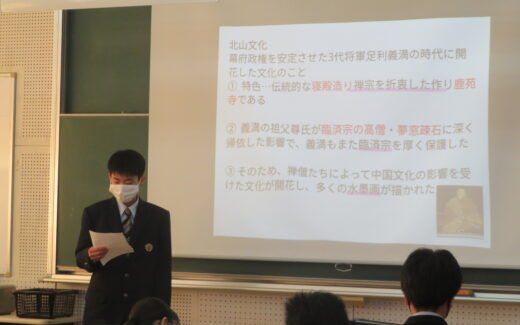 本日2時間目、J1Aの教室では、社会の時間に調べ学習の発表を行っていました。 それぞれがスライドを作成し、聞いている人に伝わりやすいような工夫がされていました。自分で調べた時代について、今までよりももっと詳しくなった