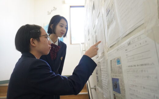 本校は、宮崎市、都城市、日向市、日南市など多方面から通学しています。そのため、早い生徒は7時に登校し、NIE活動や読書、宿題の確認、生活の記録の提出など朝のホームルームまでの時間を有意義に過ごします。今日はその一部の様子