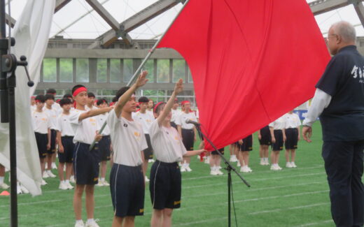 今日は体育大会が県総合運動公園内の木の花ドームで行われました。大会副会長の吉田教頭が開会を宣言し、校長、濵砂PTA会長、山田生徒会長の挨拶の後、赤団 吉岡結羽団長と白団 鏡創一団長が高らかに代表宣誓をしました。その後、団
