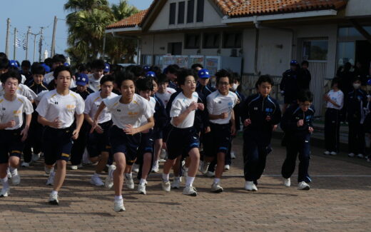 本日、青島で行われたマラソン大会の様子をお伝えします。今日のために3学期初めから体育の授業で練習を重ねてきました。日向灘に面した青島トロピカルロードを、男女ともに3キロメートル走りました。 開会式の後、校長先生のスタ