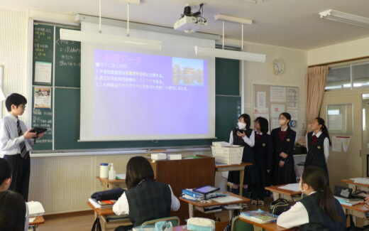 J2生の歴史の授業風景です。これまでの授業で 6人~7人のグループを作り 歴史上の人物や建物について3時間ほどかけて調べたことをプレゼンテーションしました。まずは、各グループに分かれて、最終確認です。 タブレットを使いこ