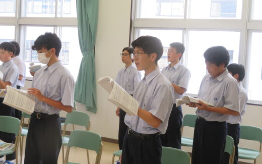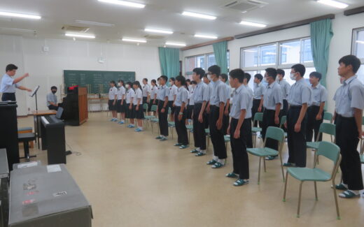 夏期課外授業4日目です。6時間目は通常全クラス自学の時間ですが、今年は文化発表会でクラス対抗の合唱コンクールが開催されるので、課外中に各クラス1回のみ、音楽室で合唱の強化練習ができることになっています。本日はJ2Aが音