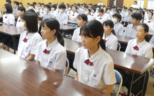 今日は令和7年度一学期の終業式でした。終業式を始める前に、鵬翔中学校の卒業生であり、現在特進英数科3年の田口菜々珠さんが、路上で倒れた人を心肺蘇生で救助を行ったことで、日本赤十字社宮崎県支部より表彰を受けました。鵬翔生