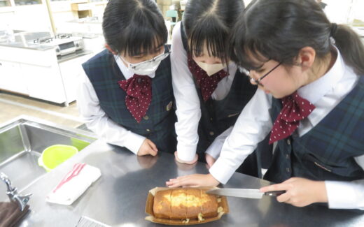 放課後、美味しそうなにおいに誘われて家庭科室に立ち寄ってみると、家庭科部が作るパウンドケーキがまさに焼きあがるところでした。本日はその様子です。タイミングよく立ち寄った自分にも1切分けてくれました。バナナの風味が引き立