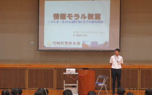本日は、宮崎南警察署生活安全課より講師を招き、全学年対象に情報モラル教室が実施されました。身近になったインターネットやSNSについて、適切な利用法を確認しトラブルを未然に防ぐことを目的に行われた教室で、みなメモを取った