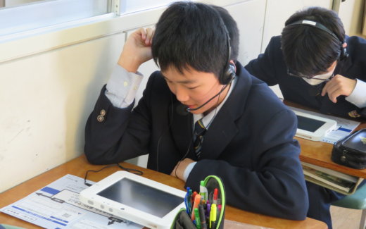 今日は、J1生を対象にGTECのスピーキングのテストが行われました。J2・J3生は、2学期に受験をしましたが、J1生は今回が初めてのスピーキングのテストでした。タブレットを使い、情報を入力したり、実際の自分の声を録音した