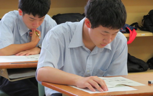 今日は、中高一貫模試が行われました。J1・J2生が集中して取り組んでいました。 J3生は総合の時間を使って、修学旅行の英文作成をおこないました。