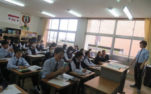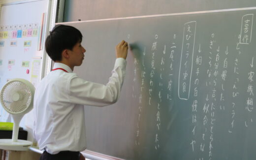 5月末から教育実習生として、鵬翔中学校の卒業生(第13期生)である二見亘俊先生(九州大学・文学部)が来てくれています。今日は、J2で国語の研究授業を行いました。 J2の国語発展クラスで「小説 盆土産」の授業を行いました