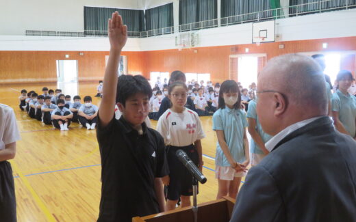 今日は、中学校総合体育大会(県大会)の壮行式が行われました。鵬翔中学校からは、陸上部、硬式テニス部、新体操部が出場します! 校長先生や生徒会長の中武そらさん(小松台小出身)からの激励の言葉を受け、選手の皆さんも頑張ろうと