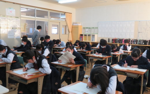 本日は、J1Bの書道の様子を紹介します。1年生は現在、小筆を用いて年賀状を作成する授業を行っています。筆を利用して書くことに慣れていないため、苦戦していましたが、これまでの授業で学んだことを駆使して作成していました。