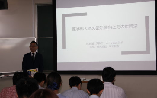 先日、医系専門予備校メディカルラボ本部教務統括の可児良友様をお招きし、「医学部入試の最新動向とその対策法」という演題でご講話していただく場を設定しました。 医学部医学科の受験に関心を抱く特進英数科生及び中学生を対象と