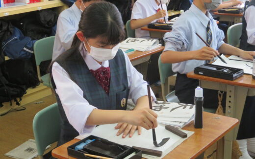 書道の授業が行われました。まずは姿勢から!!姿勢を正して、丁寧に筆を運んでいます。落ち着いた雰囲気の中、半紙に向かっていました。 文字のバランスを考えながら、真剣に書いていました。 お手本のとおりに整えて書くことは難