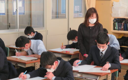 本日、第5回定期考査2日目です。昨日に引き続き、最後まで粘り強く問題と向う姿が見られました。 1限目の様子です。1限目は、全学年自学自習の時間になります。これまで学習した振り返りが出来る貴重な1時間です。生徒たちは、