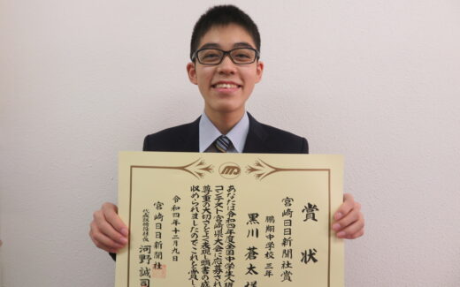 12月9日(金)、令和4年度全国中学生人権作文コンテスト宮崎県大会の表彰式が行われました。 J3-A黒川蒼太さん(宮崎南小出身)さんが 「宮崎県大会宮崎日日新聞社賞」を受賞しました。 黒川さんに受賞した気持ちを聞いた