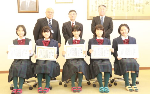 本日、「税についての作文」の表彰式が行われました。本校では、夏休みの課題として税についての作文や標語を全校生徒で書き、応募しています。また、租税教室も毎年実施しています。 今回は、税についての作文の入賞者へ、株式会
