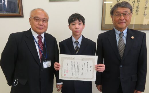 先日、2022年度第60回中学校作文コンクール「わたしたちのくらしと生命保険」で受賞したJ1-B井手大雅さん(学園木花台小出身)の表彰式が執り行われました。 今回表彰のために、一般社団法人生命保険協会宮崎県協会事務局
