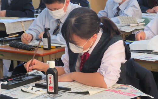 J1Aの書道の授業の様子です。生徒たちはみんな静かに集中して授業に取り組んでいました。小筆を使用して「いろは歌」を丁寧に清書していました。書道では、文字のバランスや字の太さ、「とめ」「はね」「はらい」など気を付けること