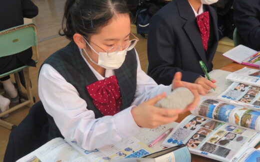 J1Bの理科の授業で、火山噴出物の一つである軽石をルーペで観察し、スケッチしました。実際に手に取ってみると、軽いことや穴がたくさん開いているとことに気づき、疑問を持ちながら真剣に取り組んでいいました。 生徒たちは、「