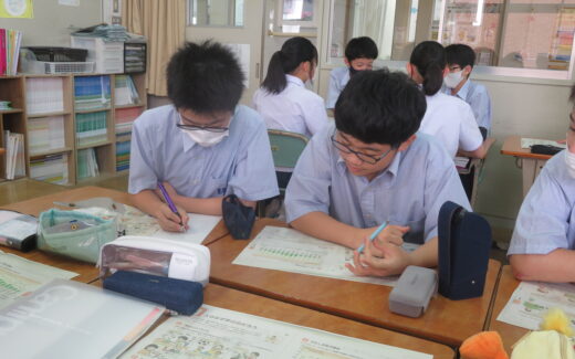 本日4限目、J1-Bは社会のテスト返却が行われました。他の教科も返却が行われています。どうでしたか?学習した成果は発揮できましたか? J1-AとJ3-Aは、家庭科。J2は、数学。J3-Bは、英会話の授業です。 J3