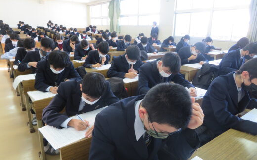 本日J3生は特進英数科の特待生チャレンジテストを受験しました。定期考査とは違い、範囲の広いテストではありましたが、全員が精一杯取り組んでいました。 また、J1・J2生は通常授業が行われました。国語の時間に2年生は百人