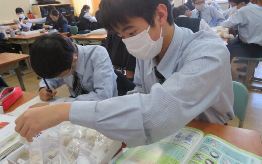本日6限目、J2-A教室から楽しそうな声が聞こえ、覗いてみると家庭科の授業が行われていました。生徒たちが小袋を手に取り、においを嗅いだり、直接触ったり、振ったりしています。カイコを振ると、中からコロコロと音がしていまし