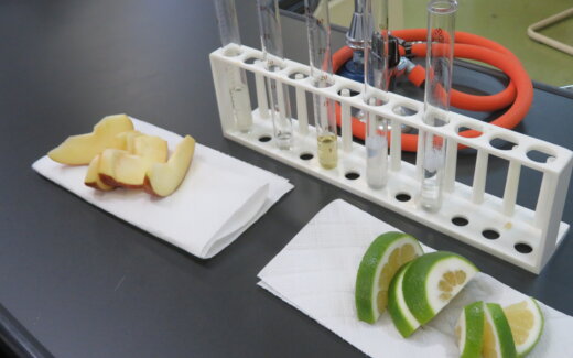 昨日サイエンス部は、酸性水溶液・アルカリ水溶液とフルーツのPH測定をしました。 測定の前に、実際になめてみて、PHの順位を予測しました。酸性のものはすっぱく、アルカリ性のものは苦みを感じ、驚いていました。 実験後は、