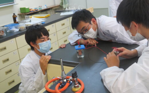 昨日サイエンス部は、希硫酸とアルミニウム板と銅板を使い、電池をつくる実験を行いました。 銅板を10円玉で、アルミニウムを1円玉にかえて、同じ実験をしました。 見事電池ができたようで、プロペラが回っています!また、電子