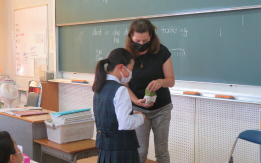 J1-A英会話の様子です。ジェニファー先生から英語で出されたお題を、ジェスチャーで表現し、何が書かれているのか答えるゲームをしていました。時折笑い声が聞こえ、今日も楽しく英会話の授業を受けていました。 お昼休憩後は、