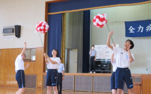 本日は、体育大会結団式の様子を写真にて紹介します。 まずは、A団・B団の団長副団長の挨拶です。 その後、J1生・J2生のクラス分けが行われました。じゃんけんをし、勝った方が先に箱からクラスの書かれた旗を選びます。 その