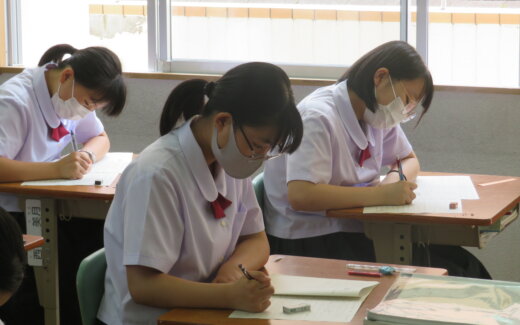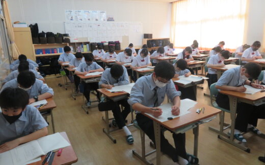 本日、第2回定期考査2日目です。J1・J2生は、美術・地歴・英G。J3生は、美術・公民・英Gが行われました。 休み時間各教室を覗いてみると、友人と一緒に問題を確認し合ったり、自分でまとめたノートで最終確認をしたり、時間