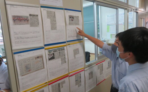 今年度も鵬翔中学校では6・7月の2か月間NIE活動を行っています。J2AでのNIE活動の様子です。今日は班ごとに新聞を読み、記事の内容などを話していました。その後それぞれが気になった記事を1つ選び、記事の要約や感想を1