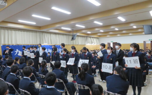 本日、生徒会企画のファミリー対面式、部活動紹介が午前中行われました。ファミリー活動における目的を川﨑校長先生よりお話していただき、交流会の流れを宮﨑先生より説明していただきました。 J1生への挨拶は、小玉瑞季さん。J1