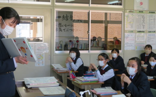 本日、J3の家庭科の授業では、自分たちでストーリーから考えたオリジナル絵本の紹介が行われていました。 時折笑いがおきたり、感動したり、とても楽しそうに見ていました。