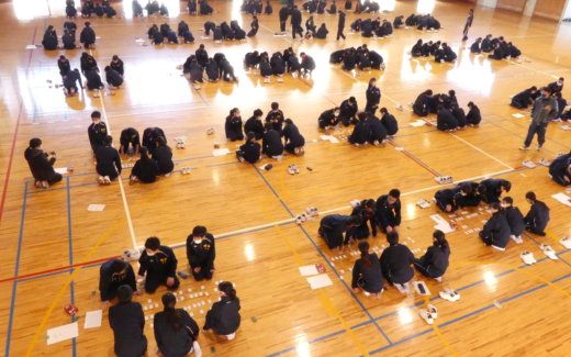 本日、午前中に百人一首大会、午後はファミリーマッチが行われました。今日は百人一首大会の様子をお届けします。百人一首大会は、文化委員会を中心に準備しています。当日の司会や札並べも文化委員会が行いますす。当日の準備等は生徒