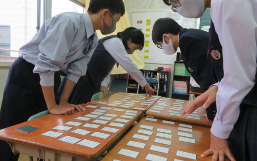 J3・国語の授業でも百人一首の練習が始まっていました。さすが3年生!暗記している句も多いようで、すばやく札を取っていました。 休み時間も百人一首を覚えるのに必死になっている姿が見られます。大会まで1か月!できるだけた