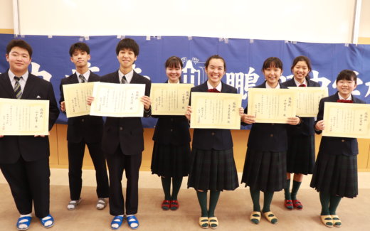本日、生徒会辞令交付式が行われました。先日行われた生徒会役員演説会の結果を受け、新しい生徒会役員が決定しました。1年間学校のために頑張ってくれた旧役員への感謝状授与と、新役員への任命状授与が行われ、新しい鵬翔中学校がス