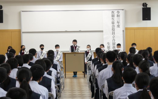 本日、次期生徒会役員立会演説会及び生徒会選挙が行われました。今選挙は、次期生徒会役員を決める選挙であり、1・2年生の各クラスより選出された立候補者がどんな学校にしたいかを全校生徒に伝える場です。 まず初めに、教頭先生と