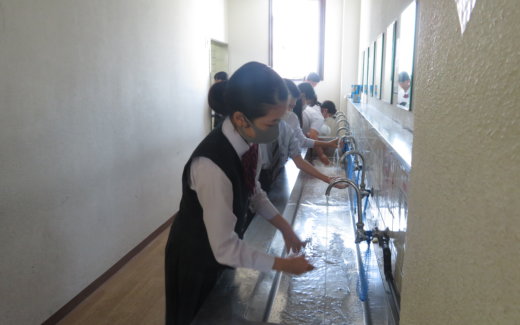 今日は、清掃の様子をお届けします。お昼休み終了後13:15~13:30は、清掃の時間になります。清掃前に、美化委員会より「カーテン・窓を開けて換気をし、無言清掃をしましょう」と放送がはいります。今日の放送担当は、J3A