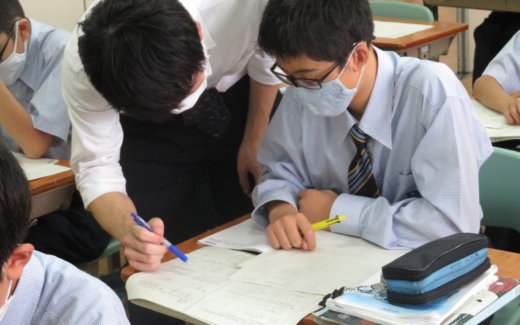 J1生の理科の授業でグループ発表が行われていました。光の屈折に関する応用問題をグループで考え、解法を説明しました。それぞれが、説明することの難しさを実感したようです。 発表を聞く側もメモを取ったりしながら、各グループ