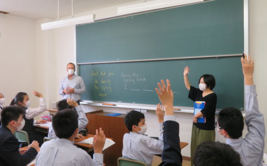 本年度新たにALTのジェニファー先生が着任されました。 引き続きデイビッド先生・トンプソン先生も英会話の授業を担当されます。 英会話の授業は1つのクラスを2つに分けた少人数授業を展開しています。ALTの先生・日本人
