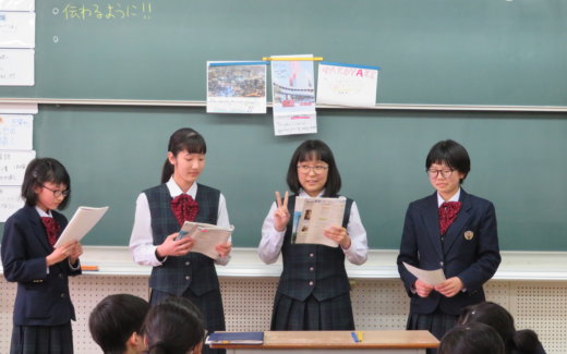 今日はJ2の英語の授業で行ったプレゼンテーションの様子をお伝えします。6つのチームに分かれてチームごとに「行きたい国・行きたい場所」について発表を行いました。 絵や写真を使って説明したり、ジェスチャーを使って伝えたり
