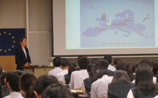 以前に事前授業の様子をお伝えしましたが、今日は「EU講演会」が行われました。特進英数科の1・2年生とJ3生を対象として行われ、駐日欧州連合国代表部よりC・シルヴィア書記官をお招きしての講演でした。 特進英数科の1年生が国