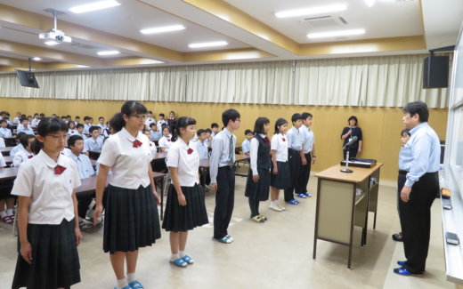 今日は、生徒会役員の新旧交代式が行われました。先日行われた生徒会の立候補者の演説会の結果をうけ、新しい生徒会役員が決定しました。今まで頑張ってくれた旧役員への感謝状授与と、新役員への任命状の授与が行われ、新しい鵬翔中学校